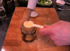 Whilst the chicken is cooking you can make the dressing and salad. For the dressing, take your small bowl or jar and add 2 tablespoons of oil, 1 teaspoon of soy sauce, the juice of half a lime and a twist of pepper. Give this a shake or whisk together to emulsify.