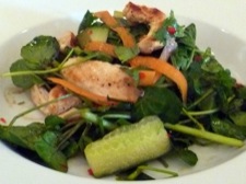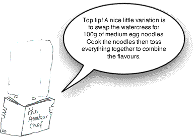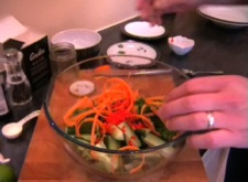 Next you need to put together the salad. Simply throw all the ingredients, (watercress, coriander, chilli, cucumber & spring onion) into your bowl and then peel long strips of carrot in with it.