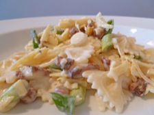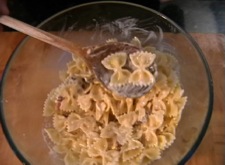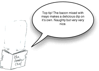 Before you start, have the cold pasta and crispy bacon (still in the pan) next to you along with the mayo, spring onion and grated cheese. Now click here!