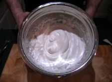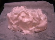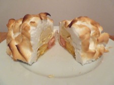 Using your large metal spoon, and working quickly, dollop the meringue mix all across the top of the ice-cream, allowing it to fall and spread down the sides and ends. Keep adding the meringue to the top until it has gone and the ends and sides are all covered. Using your spoon, press lightly all around the bottom of the meringue where it meets the baking tray. This will loosely seal the ice-cream in all the way around.
