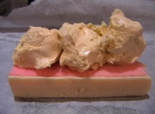 Set the meringue mix aside and bring in your battenburg cake. Using the back of a dessert spoon, press three little indentations into the cake along it's length. These will just give the ice-cream little holes to sit in. You need to work quickly for this next part before the ice-cream melts! Take the tub from the freezer and place 3 small scoops in a row onto the indentations on the cake.