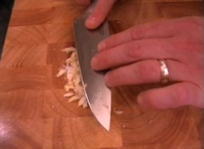 Preheat your oven to 200c then take the garlic cloves and chop them finely. Add a pinch of course sea salt to your work surface and scoop the garlic on top. With the flat of your knife, press down on the garlic and scrape lightly towards you. What you need to do is continually squash and scrape the garlic against the salt until you have a garlic paste.