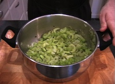 This soup really lends itself to being served cold and is a fun alternative for a summer weeknight. The subtle flavour of celery with the distinctive hint of tarragon make this a chilled delight. At only 157 calories per person, this soup is great for the waistline too! This is a three part recipe. In part one we cook down the celery. In part two we add the stock and simmer the soup. In part three we blend the soupand finish off.