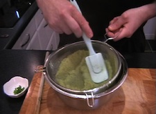 After 15 minutes, remove the pan from the heat and carefully pour the contents into your food processor, taking care not to burn yourself! Blend the soup for 20 seconds and then pour the soup through a sieve into a bowl. Using a spatula or wooden spoon, press the soup through the sieve, extracting all the delicious flavour, leaving the stringy bits in the sieve. You should be left with a beautifully smooth soup.