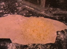 Lightly flour your work surface and place the pastry on top. Lightly dust your rolling pin with flour and then start rolling out the pastry into a large square. Pick the pastry up every few rolls to check that it doesn't stick. Roll the pastry as thin as you can without breaking. Sprinkle the grated cheese over one half of the pastry then fold over the remaining half and press together with your hands.