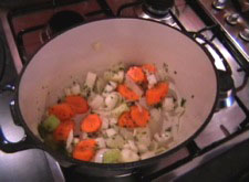 Add a knob of butter and a glug (about tablespoon) of oil to your pot. Once the butter has melted, add the carrots, leeks, garlic and thyme. Give it all a good stir to get it coated with the oil and butter and then add a pinch of salt and pepper. You can leave that and go and season the chicken thigh with salt and pepper. Add the chicken to the pan with vegetables and give it a stir around.