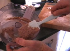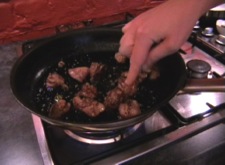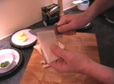 Whilst the livers are cooking, take the toast and cut the crusts off to form a square. Now this is the only tricky bit. Using a large knife, slide the blade gently into the soft middle part of the toast that will have been exposed by cutting the crusts off. Slowly and gently, run the knife through the toast (as in the photo to the right), so that you cut it in half, with each half having one toasted and one untoasted side. It's really easy once you get the hang of it. Cut each half across the diagonal to create four triangles. Place all the triangles on a baking tray, toasted side down.