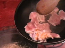 Put a large pan of salted boiling water on the hob then put a frying pan/wok on a high heat. Add a small pinch of salt and pepper to the sliced chicken and when the pan/wok is hot, put a teaspoon of oil in and start frying the chicken. Put the noodles into the pan of boiling water at this point and leave them on a high heat to boil for 5 minutes. Turn your attention back to the chicken and cook on a medium heat for 5 minutes. Move the pieces around the pan occasionally so that all sides are gently browned.