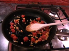 Turn the heat on your pan to a high heat, add about a tablespoon of oil and then straight away add the shallots, garlic and chorizo. You start with a cold pan so that as the pan heats up, it will gently cook the garlic and release the oil from the chorizo. Cook whilst stirring for about 2 minutes until the shallots turn pink from the chorizo. Next you need to add in the rice and give it a stir. The rice should also change colour as it absorbs the oil from the chorizo.