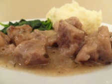 To serve, using a slotted spoon to avoid the liquid, take a nice big spoonful of pork and place it on one side of the plate. Next place your spinach next to the pork, followed by a nice dollop of mashed potato. Lastly, generously spoon the sauce over the pork and you're done!