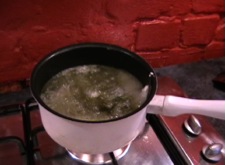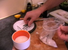 First you need to half fill your small sauce pan with oil and turn it on a medium heat. Put your pan for the fish on a medium heat whilst you make your dressing. Put the juice of half a lemon into your small bowl or jar and add 2 tablespoons of extra virgin olive oil with a pinch of salt and pepper. Whisk or shake together until emulsified. Keep an eye on your saucepan with the oil. If it starts smoking, turn the heat off.