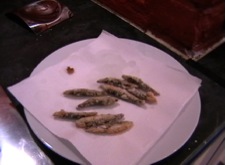 Add the next batch of whitebait and it should be almost time to remove the cod. Remove it to a board whilst you wait for the second batch of whitebait to finish. Once the whitebait is done, add them to the plate with the paper and take everything over to your work surface.