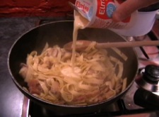 Next you need to pour in the glass of white wine to the bacon/mushrooms. Give the pan a good stir and allow it to bubble away whilst the pasta finishes cooking.