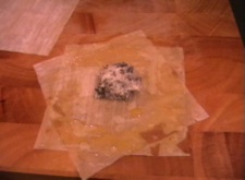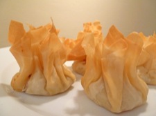 Take one of the filo squares and cut it into quarters. Brush one quarter all over with melted butter and lay another square on top at a 45° angle - so you have a star shape. Brush with melted butter and then add a teaspoon of your filling to the centre, as in the 1st photo on the right.