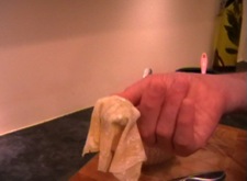 With your other hand, slide the pastry off the work surface onto your thumb and forefinger ring - the filling part of the pastry should sit nicely over the ring, as in the 2nd photo on the right.