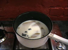 Put a pan of salted boiling water on the hob then drop in the potatoes. The potatoes should take 15-16 minutes to get to the point that they're ready to mash. Put half of the milk into your other pan and then add the fish, skin side down not overlapping. Put the rest of the milk in, together with the bay leaves and a pinch of salt & pepper. Bring this up to the boil and then simmer gently for 10 minutes.