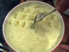 After 10 minutes preheat your oven to 190c, remove the fish to a board and drain the milk through a sieve into a measuring jug. This milk will be the basis of the white sauce that you're about to make. Drain the potatoes once the point of a knife can pass through them easily then pop them back in the pan on the hob. Turn the heat on low and get mashing. Once you've got rid of all the lumps, add a knob of butter and stir until it's all melted. Next adding a splash of milk at a time, stir the potatoes until they loosen to a nice creamy consistency. Add a pinch of salt and then set this aside whilst you make the sauce.