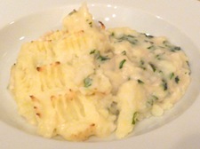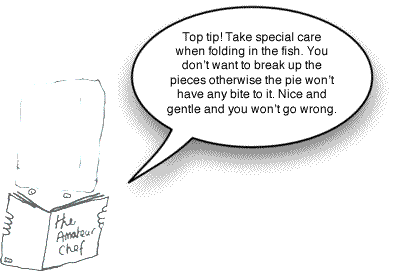 Next stir in the parsley and it's time to build the pie. Take the fish and flake it into the white sauce, discarding the skin. Gently fold in the fish, being careful not to completely obliterate it. Transfer the contents of your pan into your pie dish and then top with mashed potato. Using a knife, very gently spread the top of the pie to flatten out. Lastly, get a fork and make little fork marks all over the potato like in the photo to the right. These little peaks will go nice and crispy in the oven.