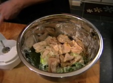 Pour the cheesy creme fraiche into a large mixing bowl and, using only one hand, toss the salad leaves through the dressing. This leaves you with a clean hand to pick up the bowl of cooked chicken/turkey pieces! Toss the meat pieces in with the salad.