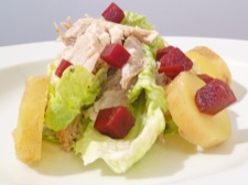 To serve, place one of the larger lettuce leaves in the middle of a plate and top with a little chicken/turkey. Add a slightly smaller leaf on top and add a little more chicken/turkey. Keep layering the leaves and turkey before resting the potato disks around the outside. Lastly, scatter some beetroot squares over the top and you're done!