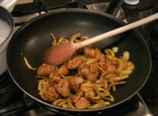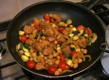 By now, the pan should be nice and hot, so add in the lamb chunks and stir to get them nice and coated with all the wonderful flavours. Cook the lamb, stirring, for about 2 minutes then throw in the tomatoes, courgette pieces and chick peas. Give everything a good stir together and cook for about another minute. Turn the heat off and leave everything to rest in the pan until the rice has finished cooking.