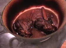 When your pan is nice and hot, just about smoking, add about a couple of tablespoons of oil and sear the shanks one at a time all over. All you're looking to do here is to get a bit of colour on the outside, so it shouldn't take more than a few minutes. After this add the bottle of red wine, shallots & garlic. Bring to the boil and then put the lid on and put it in the oven for 2 hours. If your pan can't go straight into the oven, then transfer it to an oven dish and cover.