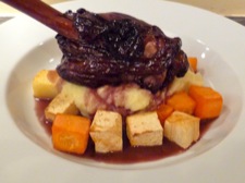 To serve, put a nice dollop of mash into the middle of your plate and scatter some of the veg around the outside. Take one of the shanks and place it on top of the mash. Lastly, spoon some of the sauce over the shanks and around the veg.