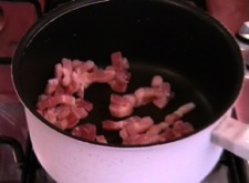 Have all your ingredients out as above and put your large pan on a high heat. Add in about a teaspoon of oil to the pan and then add the bacon. Give it a stir to stop it sticking and cook for about a minute until it starts to go brown.