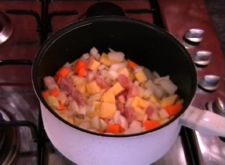 Next add in your chopped veg, stir and turn the heat down to low. Cook the veg for 5 minutes to soften slightly. Next add in your rosemary, stock and lentils. Bring this to a boil and then simmer for 15 minutes.