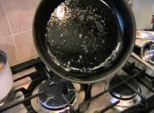 Add a little knob of butter to your hot frying pan - the smaller the better. Swirl it around so that the pan is completely coated, but not swimming in, butter.