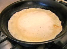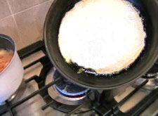 Add 1 ladle of batter to the pan and swirl it around so that it runs to the edges, as in the second photo on the right. Control the heat of your pan- it should be sizzling but not smoking on a high heat. Cook the pancake until the edges begin to come away from the pan - this should take about one minute. Gently ease around the pancake with your palette knife to check it isn't sticking. To flip the pancake - in a nice smooth motion, flip the pan upwards (don't let go!), launching the pancake into the air. Popthe pan back on the heat and cook the other side for a further minute. Both sides should be lightly golden and looking great.