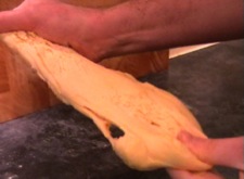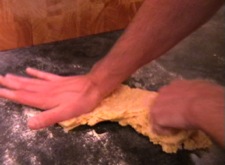 Pushing and pulling the pasta apart, pushing with one hand, pulling with the other as in the second photo on the right. Fold the dough back together and repeat the process for about 5 minutes. If you find the pasta is sticking, then add more flour to your surface. After 5 minutes or so, the dough should be a lot stretchier and not breaking up as much. It shouldn't be sticky by now either and should have a nice matte finish. If you're not quite there after 5 mins, give it another couple of minutes, it really will be worth the effort.