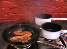 Pop the pan under the grill, or transfer to a baking tray for 4 minutes whilst you make the sauce and finish the carrots. Turn your small saucepan onto a medium heat and add 3 tablespoons of redcurrant jelly into the pan together with a shot of red wine. Give it a little stir and leave it to come to the boil.
