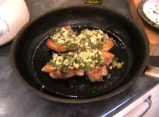 Go and turn the heat off the lamb and bring your pan over. (Careful with the hot pan on your work surface). Now you just need to spoon the crust mix onto the lamb dividing the mix evenly. Press down lightly with your fingers to compact it in place.
