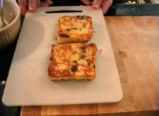 Turn the heat off everything and remove the pannetone to a board. If the egg has run off the slices and the edges are uneven, trim away any excess egg with a knife.