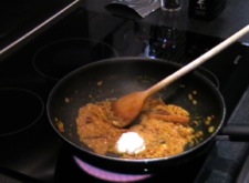 Turn the heat back up to high and add in a tablespoon of yoghurt. Stir thoroughly until the yoghurt has been completely incorporated into the curry. Repeat this with another 4 tablespoons of yoghurt, stirring it in each time. Next add in 1 tablespoon of tomato puree and stir. Pour 400ml of recently boiled water into the pan and stir again. All that's left to do is to add the chicken but first give the pieces a pinch of salt and pepper before adding to the pan. Bring everything up to the boil and simmer for 25 minutes. If you are serving rice or naan bread with the curry then time them to also be ready in 25 minutes.
