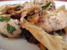 Drain the pasta, pop it back in the pan. Pour the blended mushrooms into the pasta and then add the chicken. Add the chopped parsley and the other half of mushrooms and give it a good mix together.