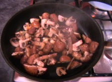 Pop the pasta into the boiling water, give it a stir and boil for 9 minutes. Your pan for the mushrooms should be getting nice and hot, so add about 2 tablespoons of oil to the pan and add in the mushrooms. Give them a stir about and cook for 5 minutes.