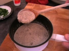 Add in the garlic to the mushrooms and cook for a further 30 seconds. Turn the heat off the mushrooms and remove half of the mushrooms to a plate or bowl. Put the mushrooms back on the hob and add in the chicken stock. Give it a stir and then transfer the contents of the pan to your bowl/pan to blend. Blend the mushrooms until you have a course mushroom paste. Add in the single cream and give it a good stir.