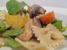 Simple flavour combinations executed well always produce great results, as this pasta salad proves. Pasta bows coated in a mustardy dressing with juicy grilled flat mushrooms and peppers, all mixed together with baby spinach and rocket. Simple tasty food. This is a two part recipe. In part one we make the dressing and start grilling the veg. In part two we finish everything off and assemble the salad.
