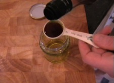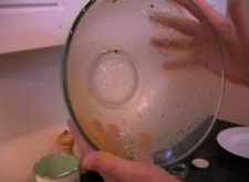 Now take your mixing bowl and pour in the dressing. Now you need to roll the dressing around the bowl, coating the insides, as in the second photo to the right, before throwing in the salad and tossing together with your fingers.