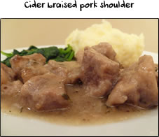 Put a pan of salted boiling water on the hob and add the potatoes straight in. They should take about 15-16 minutes to be ready to mash, so if you leave them for 10 minutes, you should be able to get everything finished at the same time. After 10 minutes, have your grill preheated to a high heat, then season the pork on both sides with salt & pepper.