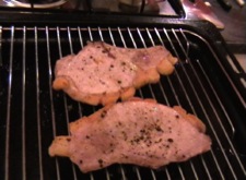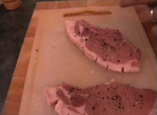 Using a sharp knife, you need to make small incisions into the fat of the pork, as in the photo on the right. Cut through the fat every inch or so. Put the chops under the grill for 3 minutes each side and then wash your hands and get rid of your chopping board.