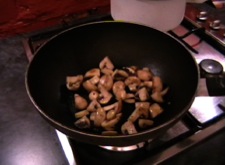Whilst the chops are under the grill, put your other pan on the hob on a high heat and go and quarter the mushrooms. Add a swirl of oil to the pan and then drop in the mushrooms. Add a pinch of salt and pepper to the mushrooms and give it a stir. Check the potatoes and if they're ready to mash, drain them and then put them back in the pan. Give the mushrooms another stir and then the pork should be ready to turn. Turn the pork and put them back under the grill.