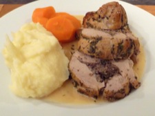 Turn the heat off and put the pork back on the board it was on a minute ago. Take it over to your work surface and and bring in your english mustard. Using your pastry brush, liberally apply the mustard all over the pork. Next you need to roll the pork over the thyme leaves until it gets covered in thyme. Put the pork back in the roasting tray and then give your hands a little wash. Put the pork in the oven for 45 minutes. Put the potatoes and carrots into the pans of boiling water and cook for 15-16 minutes until the potatoes are soft enough to mash. Drain the potatoes and leave them back in the pan until the pork is done. When the pork is done, remove from the oven to rest on a board.