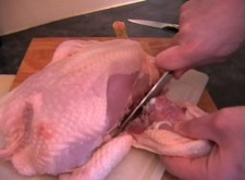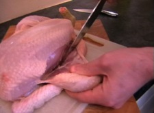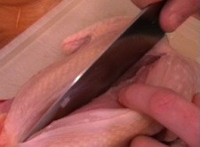 First you need to take the legs off. Where the leg meats the breast, pull away gently and then run your knife along the join. With the skin cut, as in the first photo on the right, keep cutting using small gentle cuts to ease the leg away from the breast. When the kife reaches a bone, stop cutting and then bend the leg back and away from the breast. Use little cuts to cut around the bone, removing the leg. Repeat this on the other side.