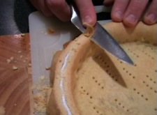 To trim the pastry case, lie the blade of a small sharp knife almost flat against the rim of the flan case and gently scrape away exposing the top of the rim. Do this all the way around the case, as in the 3rd photo on the right.
