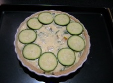 Next briefly whisk the eggs in the measuring jug before adding 150ml of double cream. Whisk this briefly before adding the peppers, onion and spinach. Stir thoroughly and season with a good pinch of salt and pepper. Pour the mixture into the pastry case and gently place slices of courgette in a circle on top.