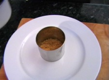 Place one cooking ring in the middle of each of your serving plates. Press half of the biscuit mix into the bottom of each ring and push down firmly with the back of a spoon. Set the plates aside.