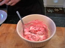 Pour the double cream into a bowl and whisk until it is really nice and thick. You want the consistency to be such that if you turned the bowl upside down, the cream wouldn't fall out. Next, add in a teaspoon of caster sugar and briefly mix again. Add your raspberries to the cream, trying not to add too much juice. Gently fold the raspberry cream mix before adding a teaspoon of vanilla extract. Fold in the vanilla then spoon half of the mix into each of your cooking rings, on top of the biscuit base.